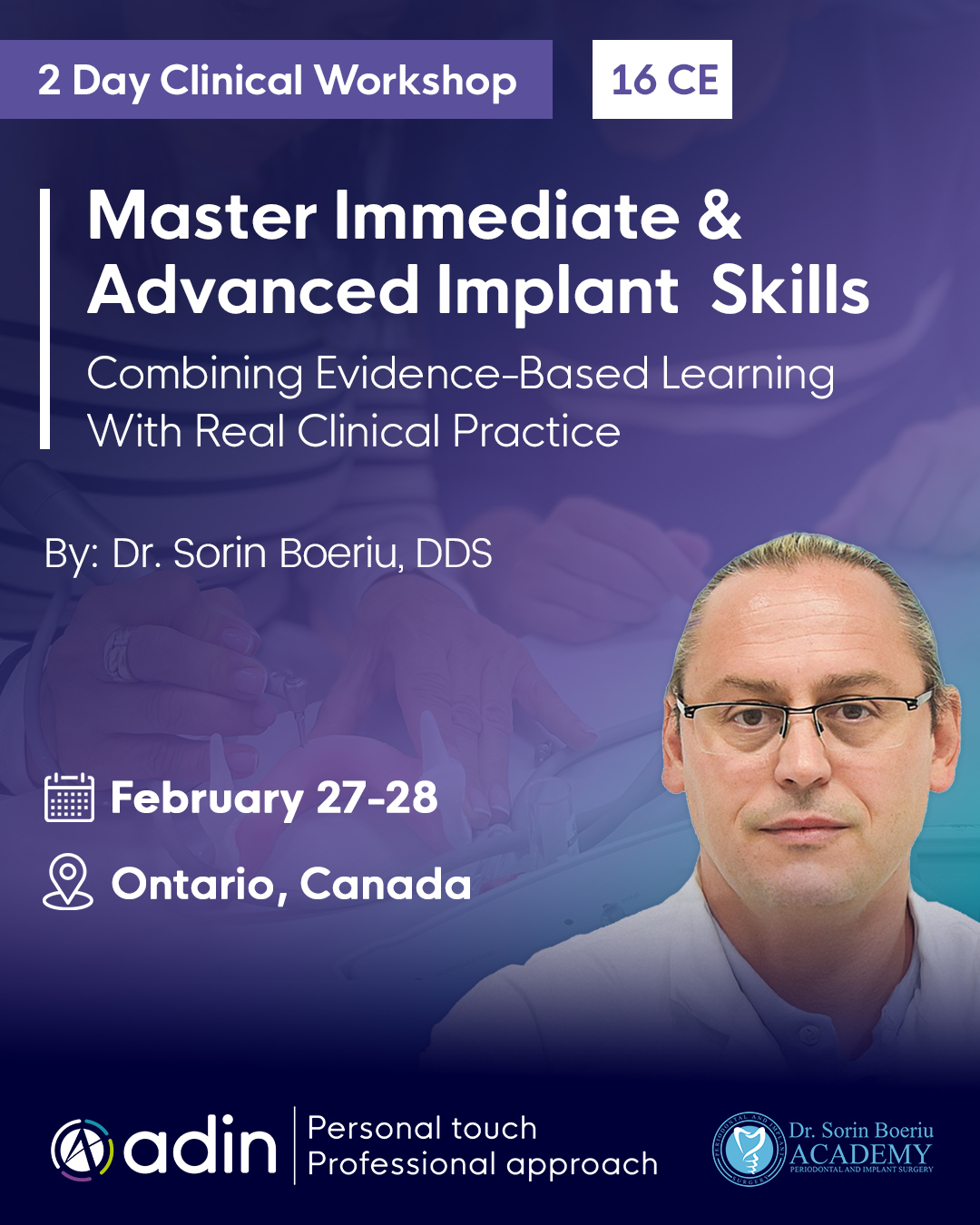Join Dr. Sorin Boeriu for a 2 day hands-on clinical workshop designed to help you master immediate and advanced implant techniques. Learn evidence-based protocols, gain real clinical experience, and earn 16 CE credits while elevating your confidence and patient outcomes.